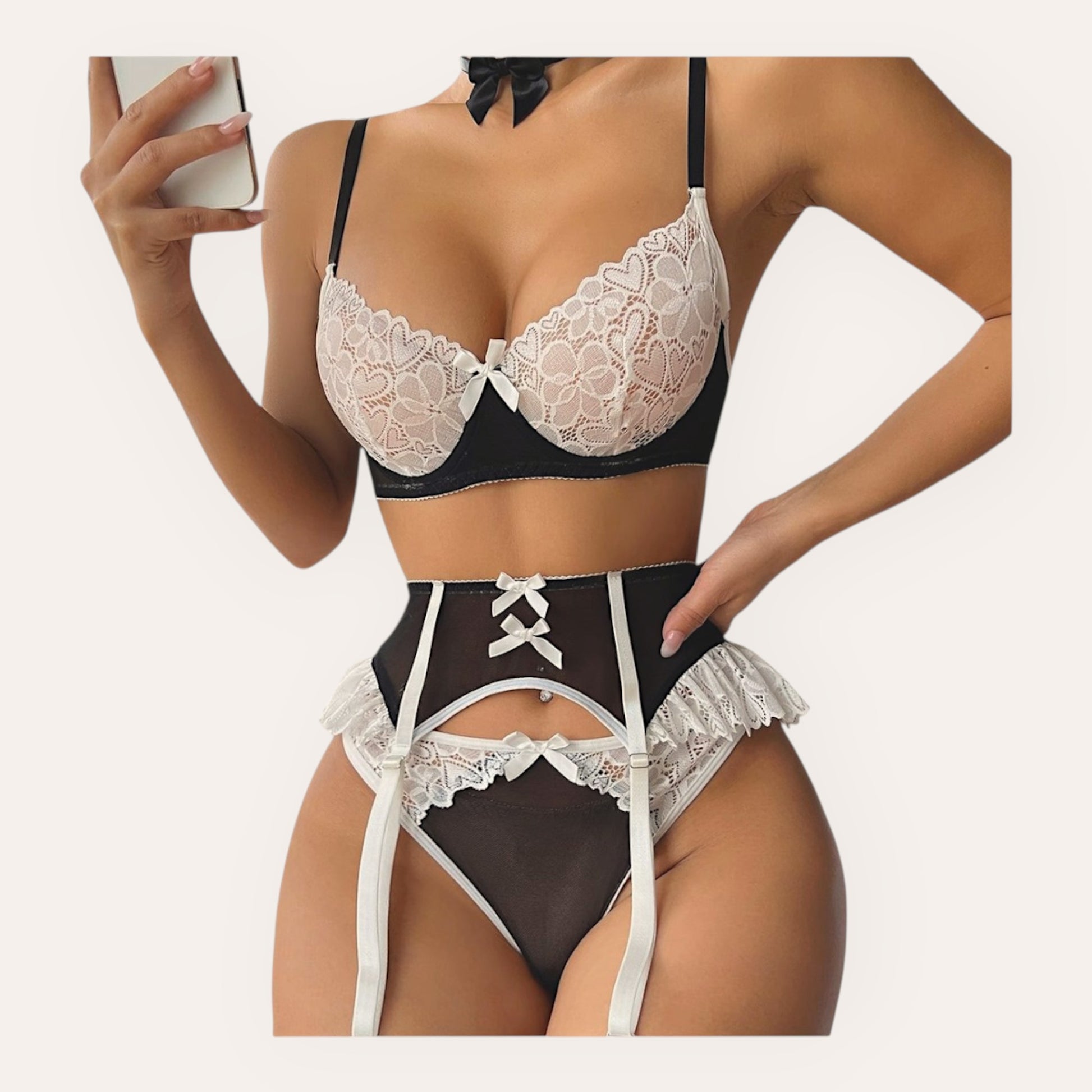 Style: 3-piece lingerie set (bra + panty + garter belt)